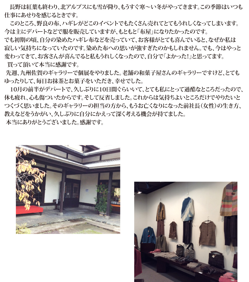 今回、小川村が震源地で大きな地震が起こりました。すごい揺れだったのですが、おかげ様で被害はありませんでした。震源地より、お隣の白馬村、小谷村の方が被害がひどかったようです。工房は昔からの蚕小屋も仕事部屋に使っていて、もともと傾いているので、心配していましたが、倒れないですみ、ホッとしています。